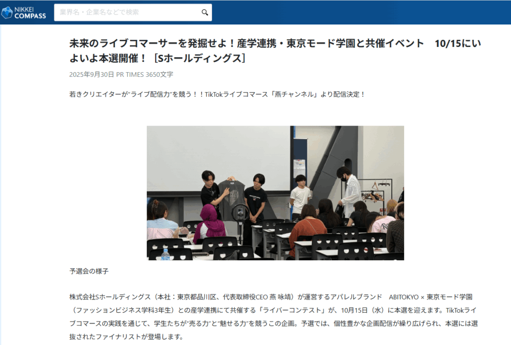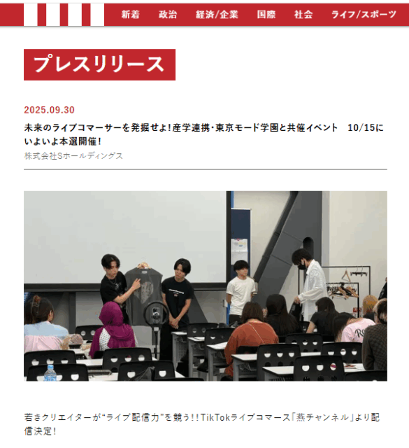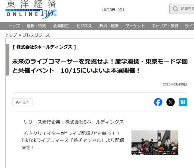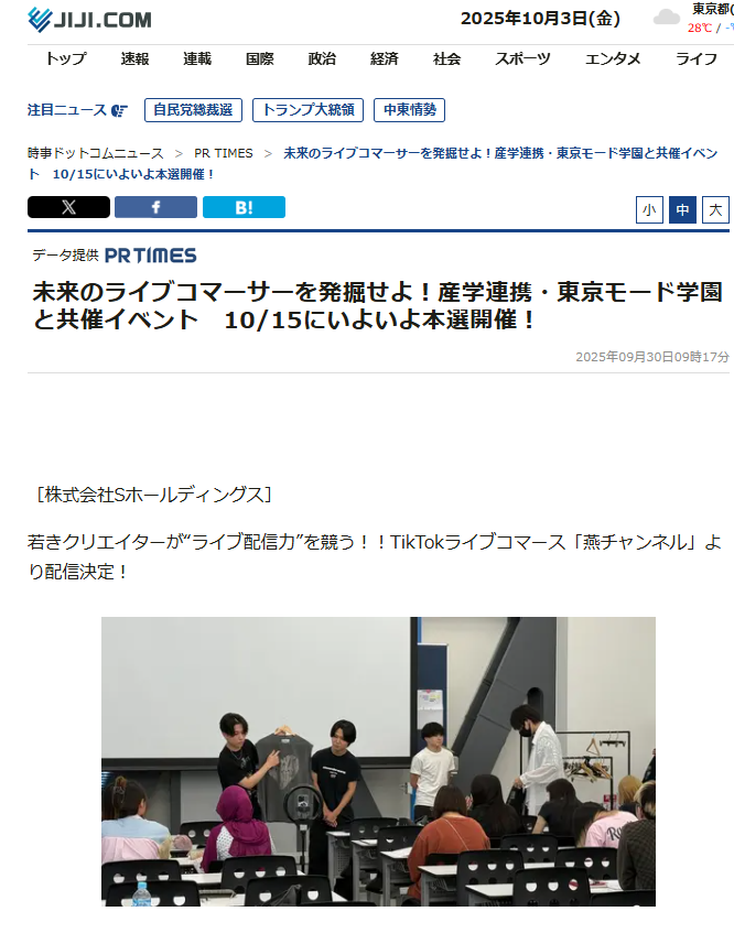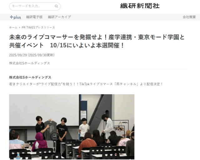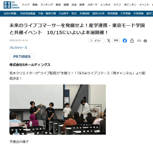 「未来のライブコマーサーを発掘せよ!産学連携・東京モード学園と共催イベント 10/15 にいよいよ本選開催!」の記事が、合計 45社 のメディアに転載されました。