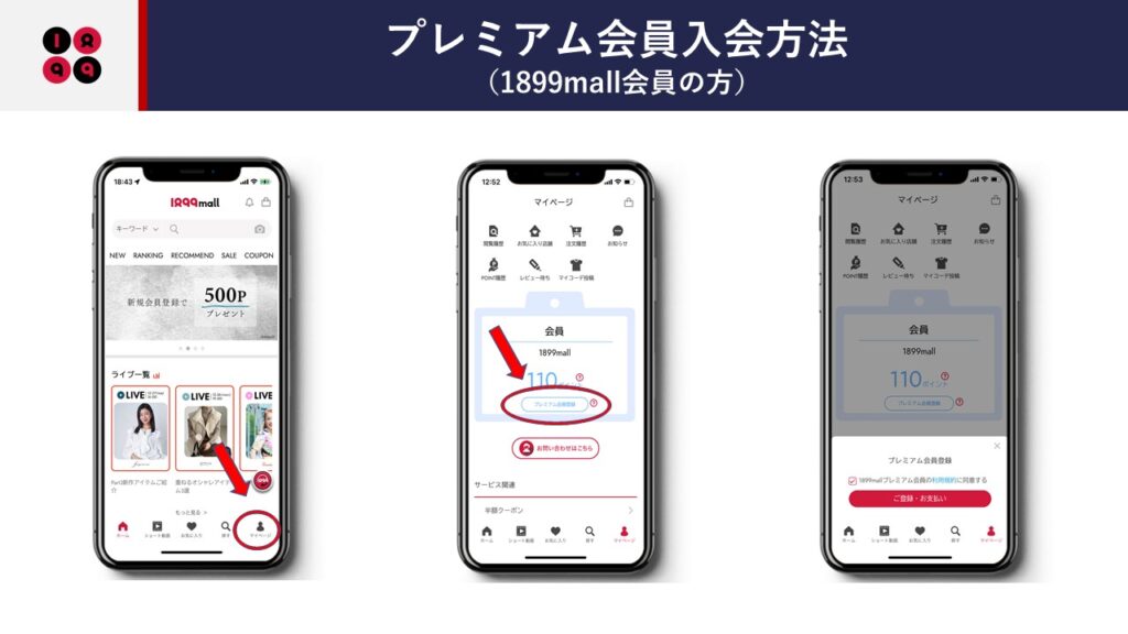 <「プレミアム会員」の登録の流れ(初めて1899mallをご利用する方)>